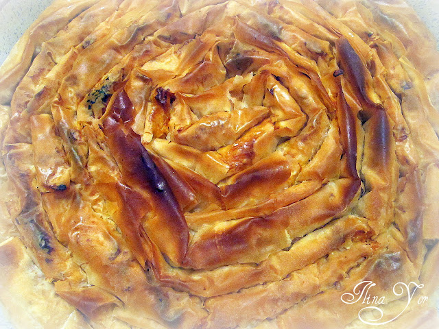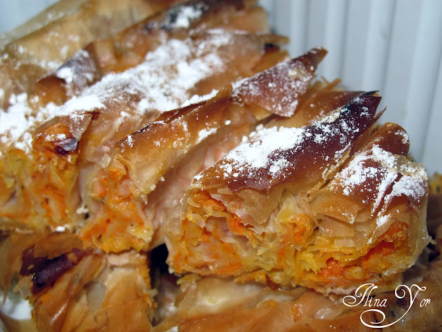 Смажте маслом противень на котором будет баница. Взять три листа кори, два смазать растительным маслом на третий выкладываем : тыква, присыпать сахаром, сухарями, корицей и орехами. Закручиваем все в рулет и выкладываем спиралью на противень начиная от центра как на фотографии. Продолжаем, пока не кончаться листы теста.
